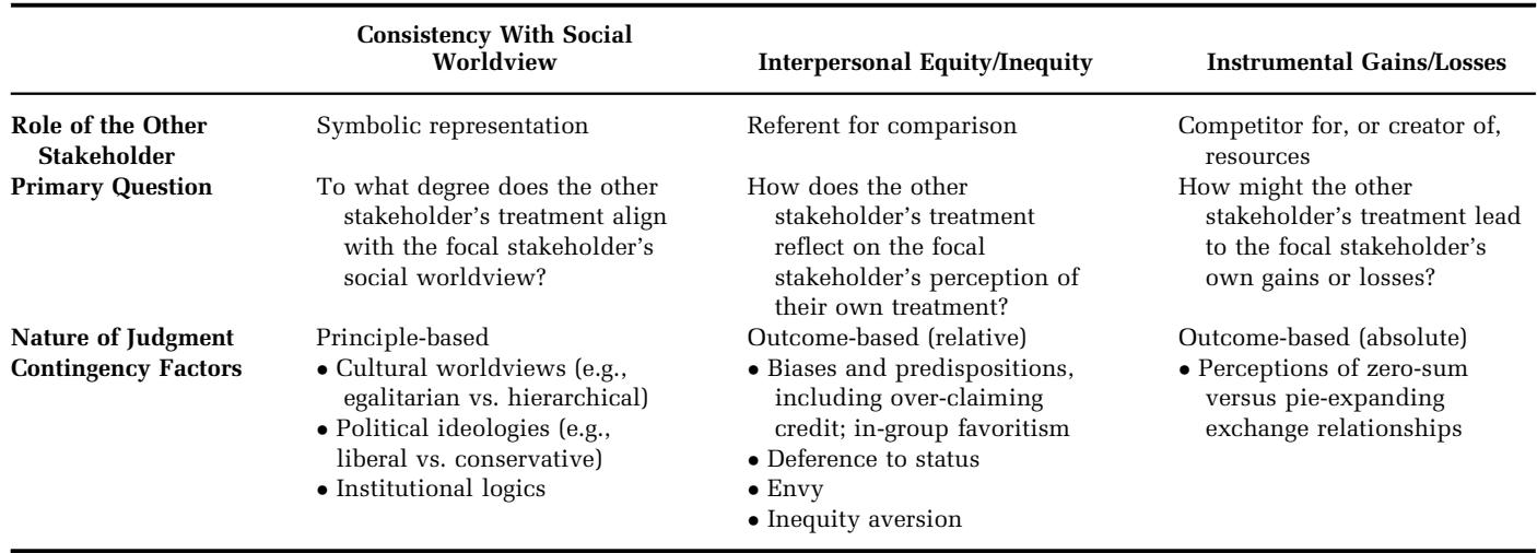 In sum, the focal stakeholder’s worldview will shape both whether the different outcome-based assessments are prioritized and how such assessments are made. The social process of stakeholder utility thus begins with the focal stakeholder’s worldview, and their ultimate utility depends not only on the degree to which the other stakeholder’s treatment is perceived as consistent with that worldview—a principle-based assessment—but also on how that worldview shapes the importance and nature of the outcome assessments—interpersonal equity comparisons and assessments of instrumental gain or loss. 总之,核心利益相关者的世界观将决定不同基于结果的评估是否被优先考虑,以及这些评估如何进行。因此,利益相关者效用的社会过程始于核心利益相关者的世界观,而他们的最终效用不仅取决于其他利益相关者的待遇是否被视为与该世界观一致(基于原则的评估),还取决于该世界观如何塑造结果评估的重要性和性质(人际公平比较以及对工具性收益或损失的评估)。