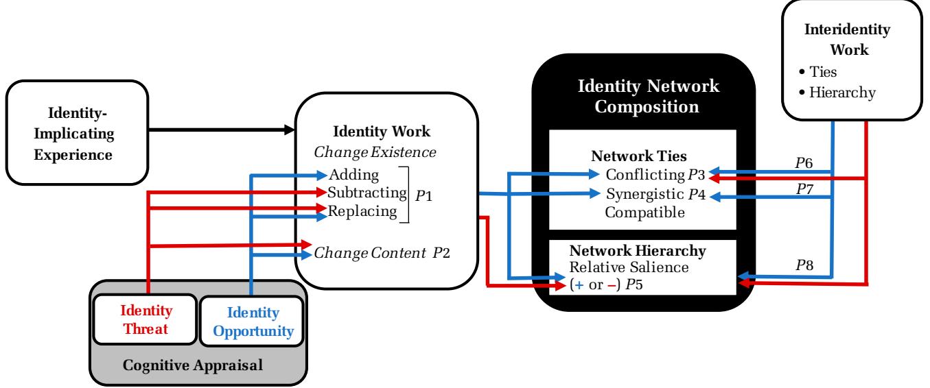 Importantly, when individuals engage in each of the forms of identity work described above, the implications of this work do not stop with the focal identity. Rather, changes to one identity may trickle throughout the identity network, changing the relationships between identities. In this section, we explore the implications of identity work for the identity network and formulate propositions around the impact that identity threats and opportunities will have on the network due to the types of identity work they engender. In a later section, we address specifically how individuals may deal with these network implications. 重要的是,当个体进行上述每种身份工作时,这种工作的影响并不局限于核心身份。相反,对一种身份的改变可能会渗透到整个身份网络中,改变身份之间的关系。在本节中,我们将探讨身份工作对身份网络的影响,并围绕身份威胁和机遇由于其引发的身份工作类型而对网络产生的影响提出命题。在后面的章节中,我们将具体讨论个体如何应对这些网络影响。