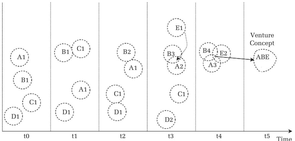 At time $^ { t 0 }$ , the assumption is that all four $( A 1 , B 1$ $C 1$ , and $D 1$ )have initial ideas and intentions (represented by “1”) before they interact. Some of them intentionally explore the possibilities their ideas present, while others do so by chance. At t1, because of their similar professions, an interaction ensues between the two scientists but does not produce a shared idea. However, the food scientist receives a new input from this interaction $( B 1 { } B 2 )$ , while the plant scientist does not $\left( C 1 { - } C 1 \right)$ . At t2, the food scientist interacts with the chef, while the plant scientist converses with the forester. At t3, the chef and the food scientist connect at some level and manage to create a shared idea. As a result of this interaction, their ideas evolve $. A 1 { } A 2$ and $B 2 { } B 3$ . At this stage, an industrial designer $( E )$ joins the conversation and takes the shared idea of the chef and the food scientist to the next level. Because the plant scientist and the forester do not connect, their interaction ends, but the forester has gained new insights into resolving some of the challenges she has been facing $( D 1 { } D 2 )$ . At $t 4$ , the interactions between the chef, the food scientist, and the industrial designer lead to shared ideas $( A 3 , B 4 , E 2 )$ , represented by the intersection of the three circles in Figure 1. This intersection of ideas, wherein they combine, recombine, and transform, gives rise to a venture concept “ABE”; this concept might be a subjective conceptualization in the three individuals’ minds, but it may also be inscribed as an artifact, such as a concept paper or a sketched diagram. The interactions between the chef, the food scientist, and the industrial designer might not have occurred automatically because of their disconnectedness and inherent heterogeneity. However, although random and nonlinear, their interactions were facilitated through interventions (e.g., through spatial dimensions). Early-phase support systems can, therefore, catalyze the emergence of venture concepts. 在时间 \( t_0 \) 时,假设所有四个(A1、B1、C1 和 D1)在互动前都有初始想法和意图(用“1”表示)。其中一些人有意探索其想法带来的可能性,而另一些人则是偶然这样做。在 \( t1 \) 时,由于他们职业相似,两位科学家之间发生了互动,但并未产生共同想法。然而,食品科学家从这次互动中获得了新的输入(B1 → B2),而植物科学家没有(C1 → C1)。在 \( t2 \) 时,食品科学家与厨师互动,植物科学家与护林员交谈。在 \( t3 \) 时,厨师和食品科学家在某个层面上建立联系,并成功创造了一个共同想法。作为这次互动的结果,他们的想法得到了发展:A1 → A2,B2 → B3。在这个阶段,一位工业设计师(E)加入了对话,并将厨师和食品科学家的共同想法提升到了新的水平。由于植物科学家和护林员没有建立联系,他们的互动结束了,但护林员从这次互动中获得了解决她一直面临的一些挑战的新见解(D1 → D2)。在 \( t4 \) 时,厨师、食品科学家和工业设计师之间的互动产生了共同想法(A3、B4、E2),如图1中三个圆圈的交集所示。这种想法的交集——其中他们进行组合、重组和转化——催生了一个创业概念“ABE”;这个概念可能是三个人心中的主观概念化,但也可能被记录为一种人工制品,例如概念文件或草图。厨师、食品科学家和工业设计师之间的互动可能不会自动发生,因为他们彼此孤立且本质上存在异质性。然而,尽管这些互动是随机且非线性的,但它们通过干预(例如通过空间维度)得到了促进。因此,早期阶段的支持系统可以催化创业概念的出现。