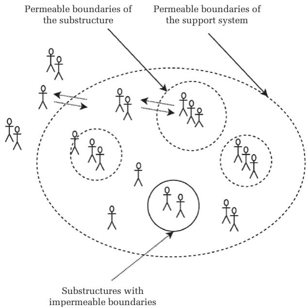 Openness makes the substructures dynamic—initially fuzzy, shifting, continually recombining, and changing shape until a semblance of stability is reached through learning and adaptation. At the beginning of their formation, the substructures are evolving and in a constant state of flux as heterogeneous prospective entrepreneurs with varying emotions, beliefs, interests, and preferences interact. Based on these heterogeneous factors, they may decide to stay or leave a substructure and explore options in other emerging substructures as they engage in interactions. At this stage, it is less costly to leave than to stay in a nascent substructure because a prospective entrepreneur would not have invested much time and energy, and staying in a substructure with less potential for contributing and gaining is futile. Also, at this stage, the openness of substructures is important because it allows actor interactions and movement across boundaries. Without openness and cross-boundary interactions, the only option would be to stay in a subpar environment or leave the support system entirely. The substructures’ fluidity enables prospective entrepreneurs to learn and select a substructure where their contribution would be more valuable. 开放性使子结构具有动态性——最初是模糊的、不断变化的,并且持续重组、改变形态,直到通过学习和适应达到一种稳定的表象。在子结构形成之初,它们处于不断演变和持续变化的状态,因为具有不同情感、信念、兴趣和偏好的异质潜在创业者之间会发生互动。基于这些异质因素,他们可能会决定留在某个子结构中或离开,并在参与互动的同时探索其他新兴子结构中的选择。在这个阶段,离开比留在一个新兴子结构中成本更低,因为潜在创业者不会投入太多时间和精力,而留在一个贡献和收益潜力较小的子结构中是徒劳的。此外,在这个阶段,子结构的开放性很重要,因为它允许行动者之间的互动以及跨边界的流动。如果没有开放性和跨边界互动,唯一的选择要么是留在一个质量低下的环境中,要么是完全离开支持系统。子结构的流动性使潜在创业者能够学习并选择一个他们的贡献会更有价值的子结构。