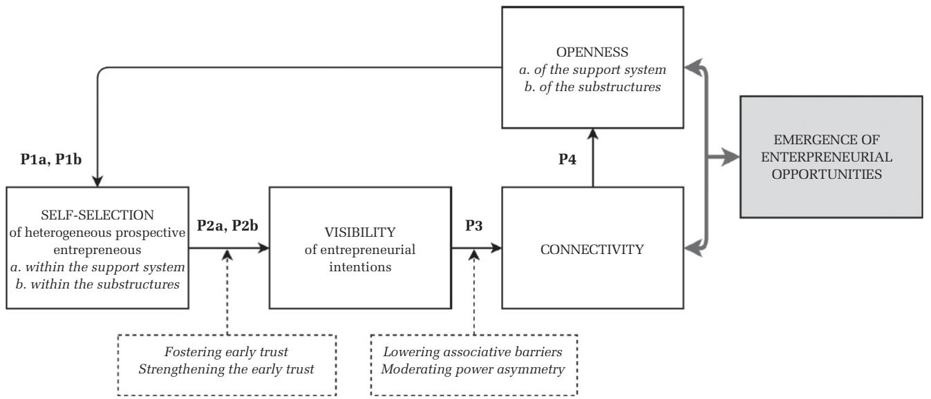 Proposition 2a. Self-selected prospective entrepreneurs are more likely to reveal their entrepreneurial intentions as moderators foster an atmosphere of early trust, spurring interactions at the support system level. 命题2a。自我选择的潜在创业者更有可能表露其创业意向,因为主持人营造了早期信任的氛围,从而在支持系统层面促进了互动。