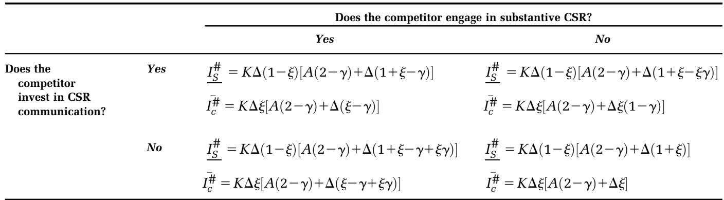 This section considers a version of the model in which CSR communication requires an investment of $I _ { c } > 0$ . At $t = 0$ , the firms simultaneously choose whether or not to invest in substantive CSR $\left( I _ { S } \right)$ and in CSR communication $( I _ { C } )$ . Both costly and zero-cost CSR activities are implemented. At $t = 1$ , CSR communication efforts are implemented, and the firms choose their quantities. It is further assumed that the costs of both investments are firm specific: $I _ { S } ^ { i } , I _ { C } ^ { i }$ where $t = F$ . $C .$ Let $\pi _ { i } ^ { s }$ denote the profit of firm $_ i$ under strategy $s$ ,where $s$ is a pair $S C$ describing the decision to invest $I _ { S }$ and $I _ { C } ,$ respectively. Hence, $S \in { Y Y , Y N , N Y , N N }$ , where $Y$ corresponds to “Yes” and $N$ to “No.” For example, $s$ $= Y N$ if the firm invests in substantive CSR and does not invest in CSR communication. In this model, symbolic CSR engagement is denoted by $s = N Y ;$ the firm does not invest in substantive CSR but undertakes CSR communication, in addition to other low-cost CSR activities with no impact in socioenvironmental outcomes. Moreover, note that $\pi _ { F } ^ { S }$ also depends on the strategy chosen by firm $C$ ,and vice versa. This section considers a version of the model in which CSR communication requires an investment of \( I_C > 0 \). At \( t = 0 \), the firms simultaneously choose whether or not to invest in substantive CSR (\( I_S \)) and in CSR communication (\( I_C \)). Both costly and zero-cost CSR activities are implemented. At \( t = 1 \), CSR communication efforts are implemented, and the firms choose their quantities. It is further assumed that the costs of both investments are firm specific: \( I_S^i, I_C^i \) where \( t = F \). \( C \). Let \( \pi_i^s \) denote the profit of firm \( i \) under strategy \( s \), where \( s \) is a pair \( SC \) describing the decision to invest \( I_S \) and \( I_C \), respectively. Hence, \( S \in \{ YY, YN, NY, NN \} \), where \( Y \) corresponds to “Yes” and \( N \) to “No.” For example, \( s = YN \) if the firm invests in substantive CSR and does not invest in CSR communication. In this model, symbolic CSR engagement is denoted by \( s = NY \); the firm does not invest in substantive CSR but undertakes CSR communication, in addition to other low-cost CSR activities with no impact in socioenvironmental outcomes. Moreover, note that \( \pi_F^S \) also depends on the strategy chosen by firm \( C \), and vice versa.