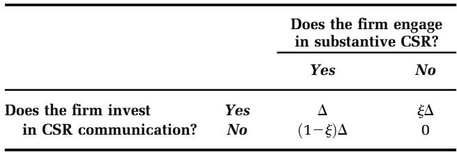 In addition to CSR communication, the firms also support other CSR activities, leading to either substantive or symbolic engagement. As already noted, the choice of symbolic CSR engagement involves low-cost CSR practices, activities, and initiatives that, when promoted by CSR communication efforts, may signal social responsibility without effectively impacting the negative socioenvironmental externalities generated by the firm. Examples include creating and supporting committees to evaluate a firm’s social responsibility initiatives (e.g., Hawn & Ioannou, 2016) or engaging in minimal corporate philanthropy (Cuypers et al., 2016). Given the low cost of this type of activity (e.g., Durand et al., 2019; Hawn & Ioannou, 2016) and for the sake of simplicity, the model assumes that these activities have zero cost for the firms. 除了企业社会责任(CSR)传播外,这些企业还支持其他企业社会责任活动,从而产生实质性或象征性的参与。如前所述,象征性企业社会责任参与的选择涉及低成本的企业社会责任实践、活动和举措,当通过企业社会责任传播努力推广时,这些实践、活动和举措可能会表明企业的社会责任,但不会有效影响企业产生的负面社会环境外部性。例如,成立和支持委员会来评估企业的社会责任举措(例如,Hawn & Ioannou,2016),或开展最低限度的企业慈善活动(Cuypers等人,2016)。鉴于此类活动的低成本(例如,Durand等人,2019;Hawn & Ioannou,2016),并且为了简化,该模型假设这些活动对企业没有成本。