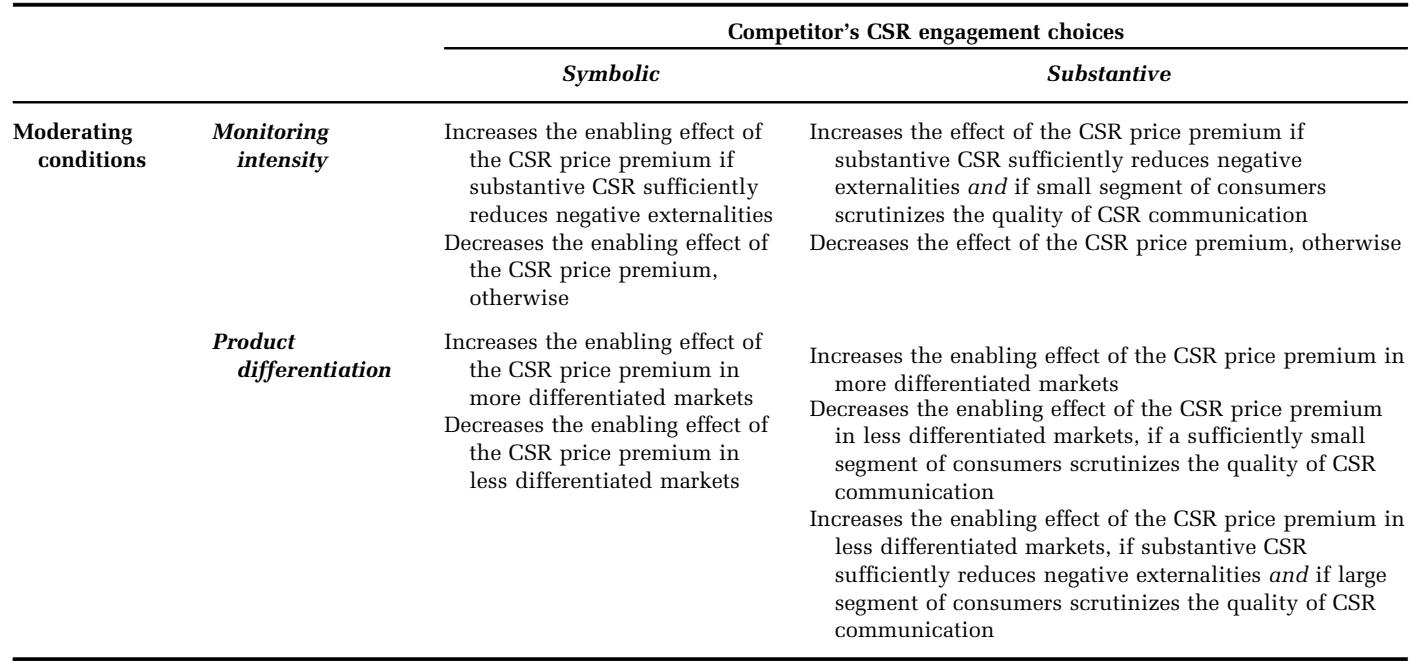 Accordingly, suppose that a segment of the consumer market cares about and scrutinizes the quality of CSR communication. When competitors only engage in symbolic CSR, the differential gains generated by the CSR price premium in the presence of substantive CSR may be particularly high, since there is no competition in this market segment (recall that the firm cannot command a CSR price premium from these consumers, unless it engages in substantive CSR). However, the same rationale obviously does not apply if competitors ex ante invest in substantive CSR. In this scenario, the differential gains implied by substantive CSR are divided between the firm and its competitors. Thus, if a segment of consumers scrutinizes the quality of CSR communication efforts, the effect of the CSR price premium is weaker when competitors ex ante engage in substantive CSR, and stronger otherwise. 因此,假设消费者市场的某一细分群体关注并审视企业社会责任(CSR)传播的质量。当竞争对手仅开展象征性的企业社会责任活动时,在存在实质性企业社会责任的情况下,由企业社会责任价格溢价产生的差异化收益可能会特别高,因为该细分市场中不存在竞争(要注意,除非企业开展实质性的企业社会责任活动,否则无法从这些消费者那里获得企业社会责任价格溢价)。然而,如果竞争对手事先投入实质性的企业社会责任活动,同样的逻辑显然不适用。在这种情况下,实质性企业社会责任所隐含的差异化收益会在企业及其竞争对手之间分配。因此,如果某一细分消费者群体审视企业社会责任传播的质量,那么当竞争对手事先开展实质性企业社会责任活动时,企业社会责任价格溢价的影响会较弱,反之则较强。