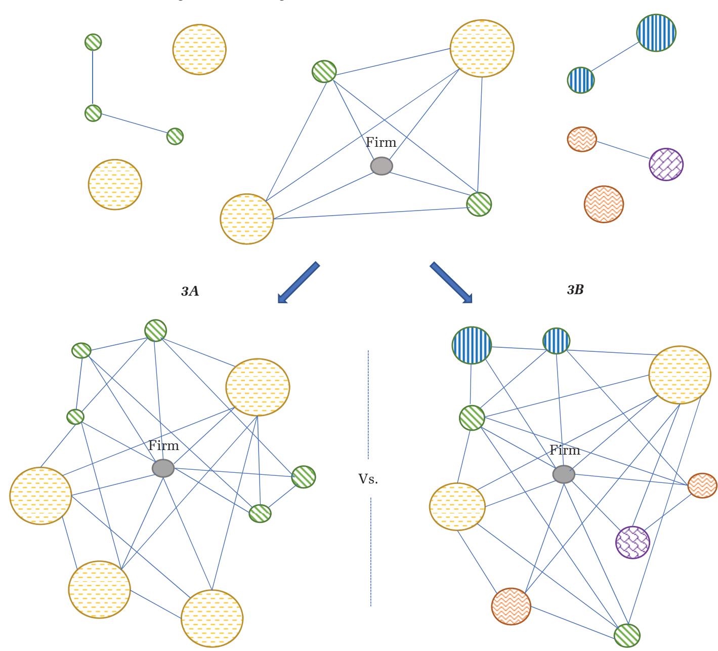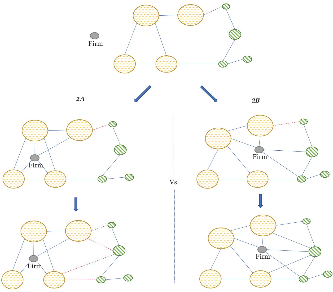 When there are weak or nonexistent connections between subcomponents, actors within a subcomponent are less likely to engage in mutual economic or social exchange with actors in another subcomponent. Seminal works in social network analysis by Simmel (1950) and Burt (1992, 2000), among others, have explained that such a network includes structural holes that managers may exploit to extract economic rents. When a firm occupies a structural hole (Figure 1A), defined as a network position that connects otherwise disconnected parties, managers act as the “brokers” of information with the ability to gather, recombine, and redirect resources to their advantage (Burt, 2004). 当子组件之间的连接微弱或不存在时,子组件内的参与者就不太可能与另一子组件中的参与者进行相互的经济或社会交换。西美尔(Simmel,1950)、伯特(Burt,1992、2000)等学者在社会网络分析方面的开创性著作解释说,此类网络包含结构洞,管理者可利用这些结构洞获取经济租金。当一家企业占据结构洞(图1A)时,即占据了一个连接原本不相连的各方的网络位置,管理者就充当信息的“经纪人”,能够收集、重组并将资源导向对其有利的方向(Burt,2004)。