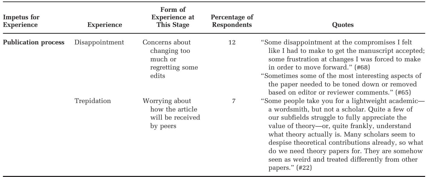 There were two other psychological highs stemming from the work of theory writing itself. One was an internal sense of pride in accomplishment. Several respondents expressed pride in the particular “accomplishment” or “achievement” of writing a theory paper in light of its inherent challenges “independent of possible publication.” Finally, in a theme that only surfaced at the initial submission stage, a handful of respondents also reported a high of dedication to the work. They noted feeling sufficiently “passionate” and “motivated” by a topic that they felt certain they would stick with it, and that their “devotion” would outlive any obstacles in the review process. 理论写作本身的工作还带来了另外两种心理上的愉悦感。一种是完成任务后的内在自豪感。一些受访者提到,考虑到理论论文写作本身固有的挑战(“与可能的发表无关”),他们为自己完成了这一特定的“成就”或“成果”而感到自豪。最后,在一个仅在最初提交阶段才出现的主题中,少数受访者还提到了一种投入工作的愉悦感。他们表示,自己对某个主题感到足够“热情”和“有动力”,并且确信会坚持下去,而且他们的“奉献精神”会超越评审过程中的任何障碍。