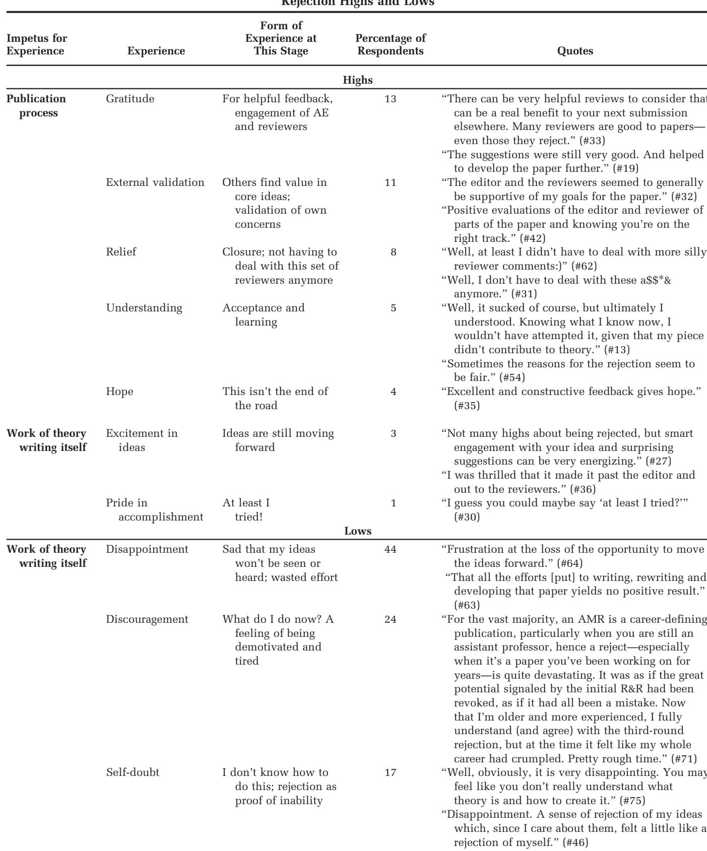 As one might expect, the psychological experiences from receiving a rejection (whether after initial submission or R&R) were skewed toward the lows, so we report those first. Further, we found that lows and highs each stemmed from different sources. Whereas the lows mostly stemmed from feelings about the work itself, the (relatively few) highs stemmed principally from reactions to the publication process. We surmise from this pattern that rejection often leaves authors feeling much pain and little pleasure from writing theory—arguably a bad combination from the perspective of motivation. 正如人们所料,收到拒稿(无论是初次投稿后还是在修改返修阶段)时的心理体验偏向负面,因此我们先报告这些情况。此外,我们发现负面情绪和正面情绪各自来源于不同的因素。负面情绪主要源于对自身工作的感受,而(相对较少的)正面情绪主要源于对发表流程的反应。从这一模式我们推测,拒稿往往会让作者在写作理论时感到痛苦,却几乎没有愉悦感——从动机的角度来看,这可以说是一种糟糕的组合。