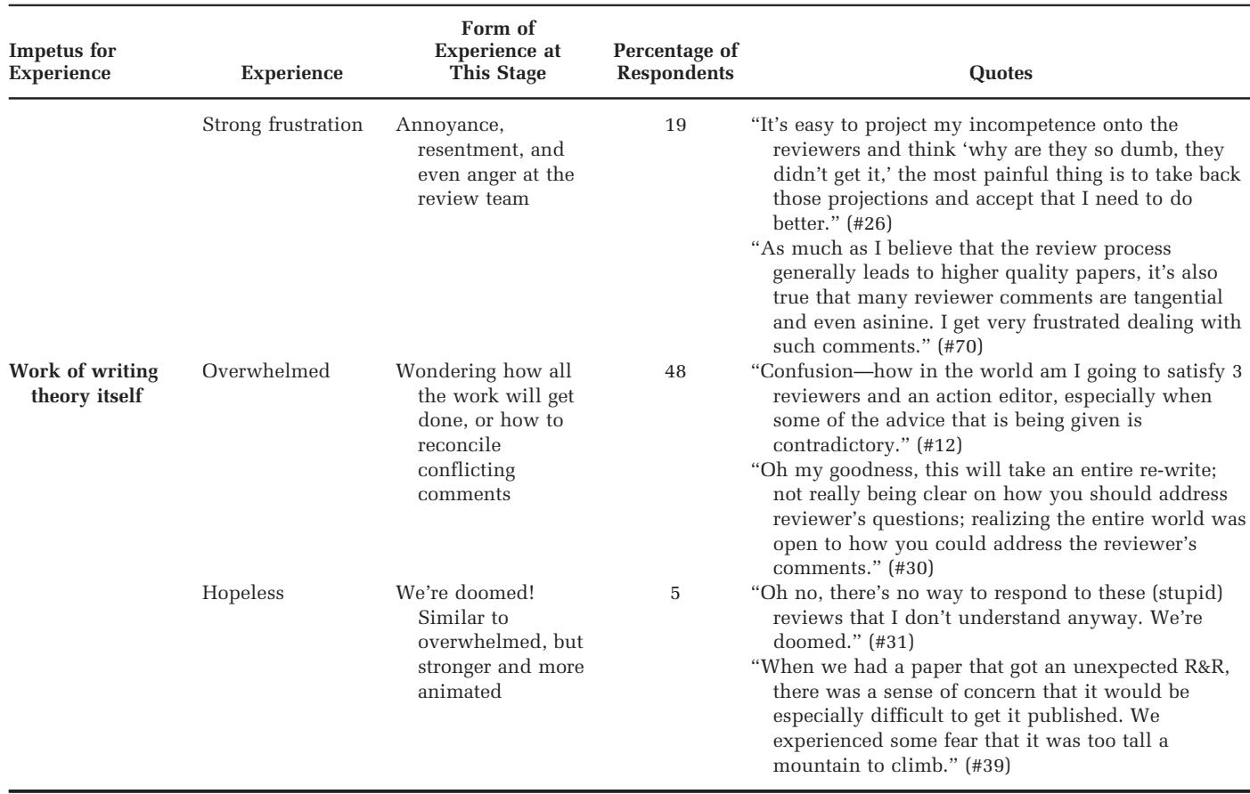 Lows. In contrast to the initial submission where we noted two targets of frustration (i.e., the writing itself or the publishing process), at the R&R stage all frustrations seem to be oriented toward the process. However, these frustrations came in two distinct varieties. The first we label as a mild frustration, which includes a feeling that one is not perfectly “heard” or “understood” by the review team, combined with a feeling that authors lack power or are “completely at the mercy” of others. As noted by one respondent: 低。与我们最初提交时指出的两个挫折目标(即写作本身或出版过程)相比,在修改与重审(R&R)阶段,所有挫折似乎都集中在过程上。然而,这些挫折有两种截然不同的类型。第一种我们称之为轻微挫折,包括一种感觉,即作者觉得自己没有被评审团队完全“倾听”或“理解”,同时还觉得作者缺乏权力或“完全受他人摆布”。正如一位受访者所指出的:
