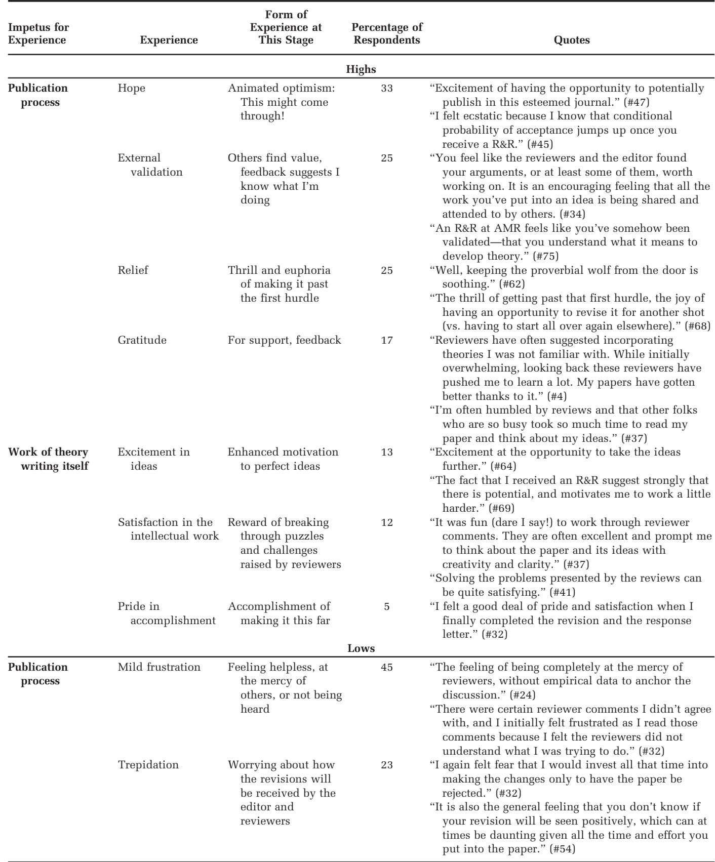 Before presenting details, we note three interesting patterns with the psychological “highs” and “lows” experienced throughout the publication process at AMR. First, many positive and negative experiences reemerged in multiple phases of the publication process. For example, pride in the accomplishment of the work was a repeated positive experience across each stage (even rejection!), while frustration was a commonly repeated negative experience. When these recurring experiences resurfaced in new phases, they often moved between the psychological foreground and background and took distinct forms. We outline below how the highs and lows of writing theory for AMR both recur and evolve in form from one publication phase to another. A second pattern we noticed was that these emotional experiences seemed to stem from one of two sources—from the work of theory writing itself or from aspects of the publication process. As such, we organize and label the tables and text according to this distinction. The third pattern we detected was that respondents felt the experience of writing for AMR often differed from that of other journals. We share insights contrasting the highs and lows of writing theory for AMR with experiences at other journals, which suggested that the highs sometimes feel higher and the lows sometimes feel lower when writing for AMR. 在介绍具体内容之前,我们注意到在AMR整个发表过程中,心理上的“高峰”和“低谷”存在三个有趣的模式。首先,许多积极和消极的经历在发表过程的多个阶段中反复出现。例如,对工作成果的自豪感是每个阶段(甚至是被拒阶段!)都重复出现的积极体验,而挫败感则是常见的重复出现的消极体验。当这些反复出现的经历在新的阶段再次出现时,它们往往会在心理的前景和背景之间转换,并呈现出不同的形式。我们将在下文概述AMR理论写作的高峰和低谷如何从一个发表阶段到另一个阶段既重复出现又在形式上有所演变。我们注意到的第二个模式是,这些情感体验似乎源于两个来源之一——理论写作本身的工作,或者是发表过程的某些方面。因此,我们根据这一区别对表格和文本进行组织和标注。我们发现的第三个模式是,受访者认为为AMR写作的体验往往与其他期刊不同。我们分享了将AMR理论写作的高峰和低谷与其他期刊的经历进行对比的见解,这表明在为AMR写作时,高峰有时会感觉更高,低谷有时会感觉更低。