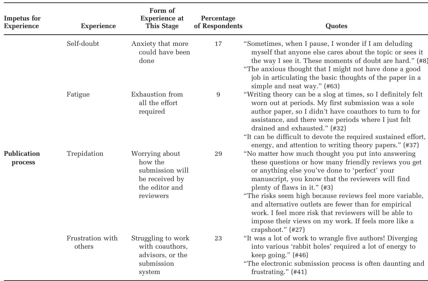 Psychological experiences reported by respondents at the initial submission stage were mixed in terms of highs versus lows but skewed toward the highs. Both highs and lows were dominated by experiences derived from the work of theory writing itself, with those emerging from the publication process residing more in the background. 受访者在初始提交阶段报告的心理体验有高有低,但偏向于积极体验。无论是积极体验还是消极体验,都主要源于理论写作本身的工作,而来自发表过程的体验则更多处于次要地位。