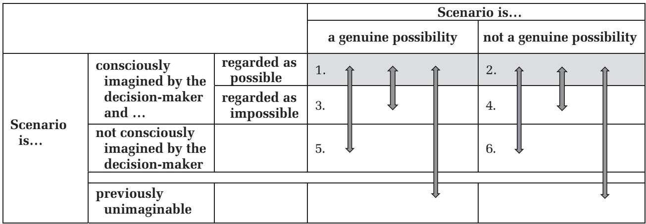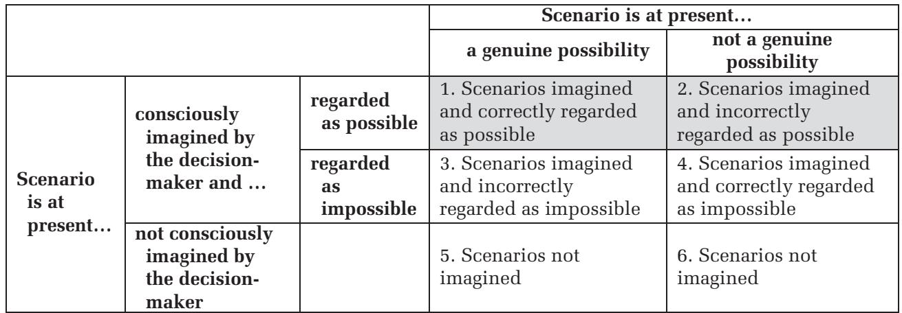 Cells 1 and 2 of Table 1 contain scenarios imagined and regarded as possible by the decision-maker, split between those that are correctly (cell 1), and those that are mistakenly (cell 2), regarded as such. Taken together, the scenarios in these two cells therefore constitute the decision-maker’s scenario space, indicated by the shaded area. The scenarios in cells 3 and 4 are those consciously imagined by the decisionmaker but excluded from the scenario space because they are regarded as impossible, correctly so in cell 4 but mistakenly so in cell 3. The scenarios in cells 5 and 6 also lie outside the scenario space, having not even entered the imagination of the decision-maker. 表1中的单元格1和2包含决策者设想并认为可能的场景,分为被正确(单元格1)和错误(单元格2)视为可能的场景。综合来看,这两个单元格中的场景构成了决策者的场景空间,以阴影区域表示。单元格3和4中的场景是决策者有意识地设想的,但因被认为不可能而被排除在场景空间之外,其中单元格4是正确的,而单元格3是错误的。单元格5和6中的场景也不在场景空间内,甚至未进入决策者的想象。