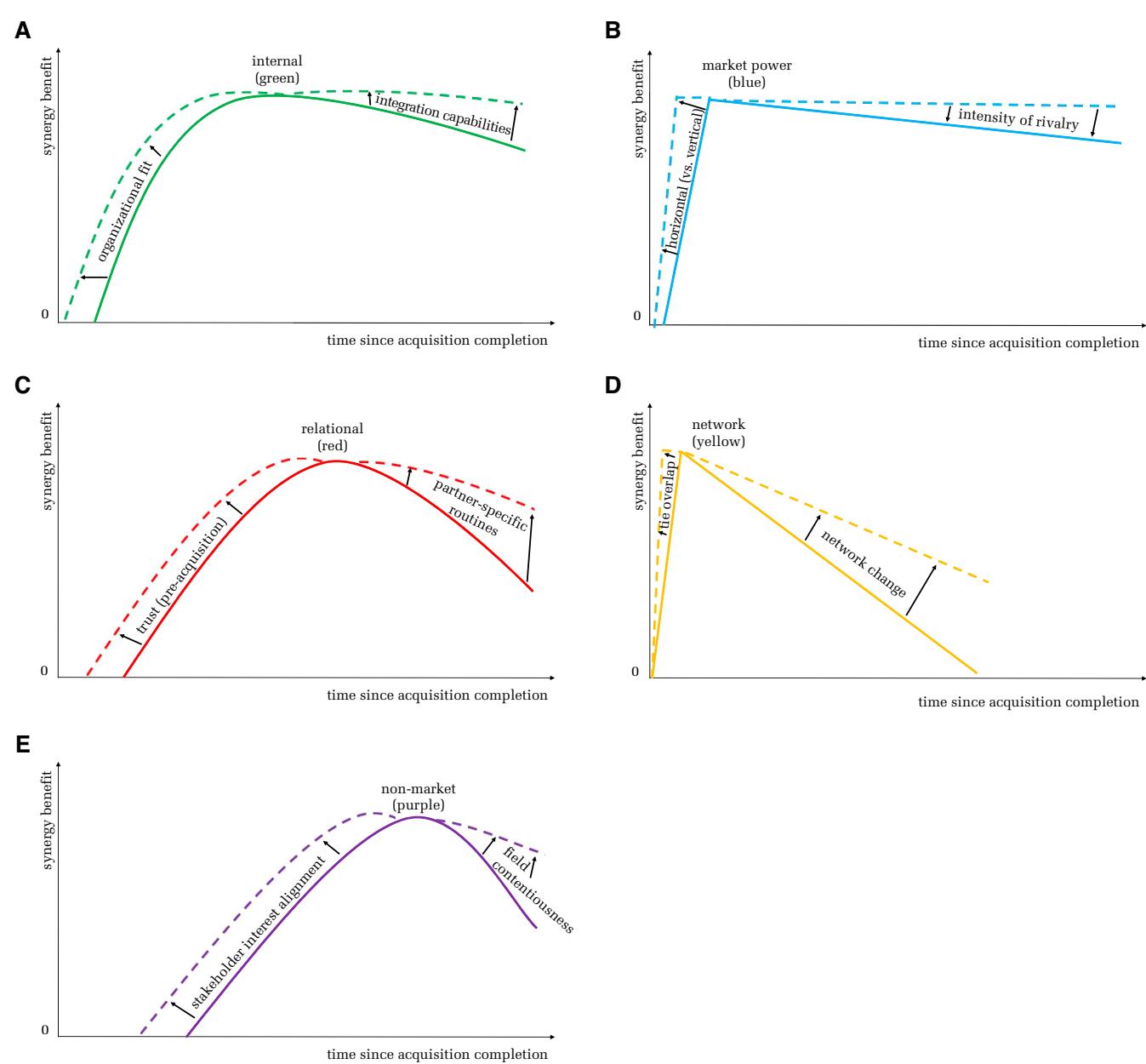 Proposition 2. Synergy duration across types: The greater the post-acquisition control the combined firm has over the assets, activities, and relationships involved in producing a synergy type, the longer the gains from that synergy type persist. 命题2. 协同效应持续时间(跨类型):收购后联合企业对产生某类协同效应所涉及的资产、活动和关系的控制权越大,该类协同效应的收益持续时间就越长。