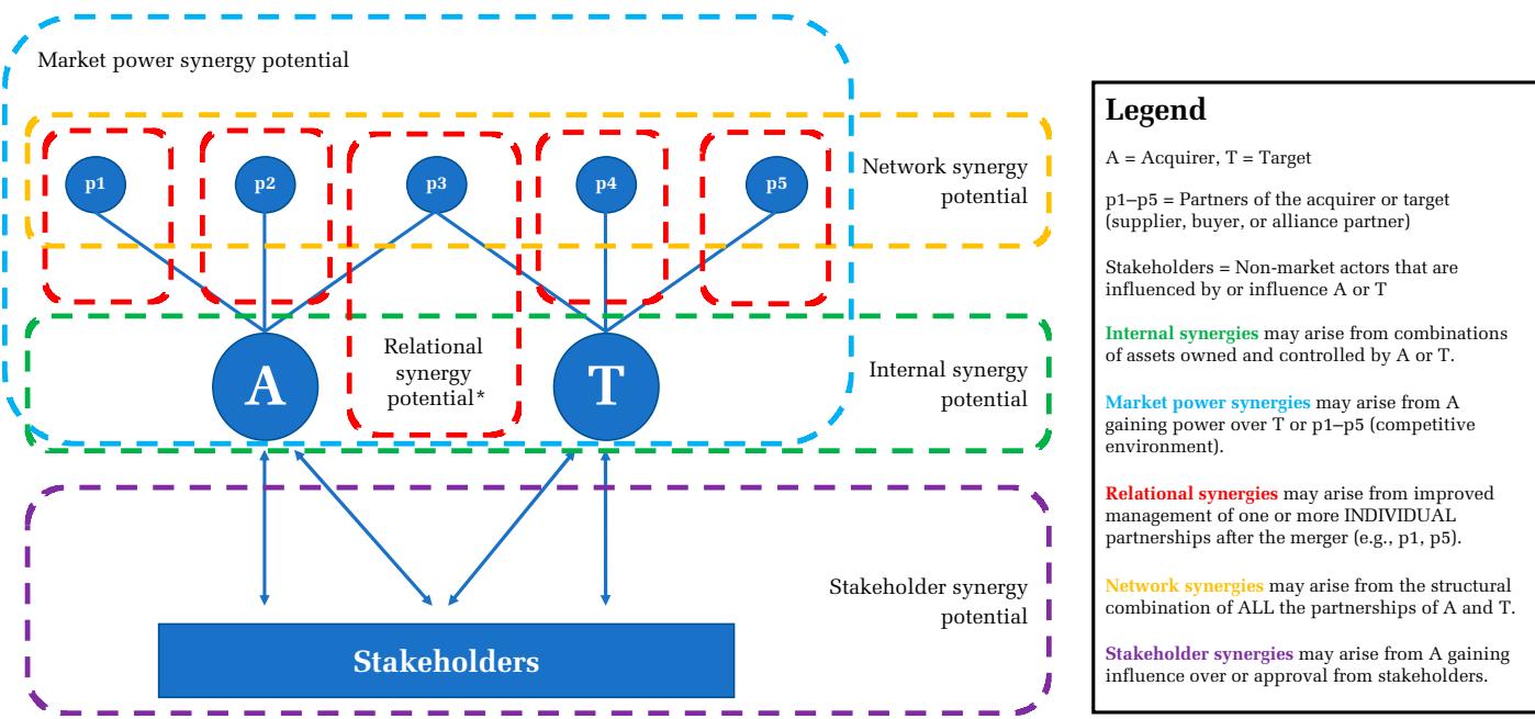 We incorporate these external cooperative perspectives into M&A research in three ways. First, we develop a theoretically parsimonious typology of five sources of potential synergy based on two underlying dimensions: the level of analysis at which valuable activities occur (firm, dyad, network, industry, or institutional context) and the governance orientation by which those activities are managed (fiat, cooperation, or market competition). This allows us to introduce three new synergy types—relational, network, and nonmarket—and to put the two long-considered in the literature (internal, also known as operational, and market power) into a systematic framework. The five synergies map onto distinct theories of economic rent: RBV theories, IO economics, the relational view, social networks theory, and stakeholder theory. This results in a classification focused on sources of synergy rather than their manifestations (e.g., abnormal returns, revenues, and costs), which has been the focus of most prior research (Andrade, Mitchell, & Stafford, 2001; Capron & Pistre, 2002). 我们通过三种方式将这些外部合作视角纳入并购研究。首先,我们基于两个潜在维度,构建了一个理论上简洁的五种潜在协同来源类型学:有价值活动发生的分析层面(企业、二元组、网络、行业或制度背景),以及管理这些活动的治理导向(命令控制、合作或市场竞争)。这使我们能够引入三种新的协同类型——关系型、网络型和非市场型,并将文献中长期研究的两种协同类型(内部型,也称为运营型,以及市场力量型)纳入一个系统框架。这五种协同效应对应不同的经济租金理论:资源基础观(RBV)理论、产业组织(IO)经济学、关系观、社会网络理论和利益相关者理论。这一分类侧重于协同效应的来源而非其表现形式(例如,异常回报、收入和成本),而这正是大多数先前研究的焦点(Andrade, Mitchell, & Stafford, 2001;Capron & Pistre, 2002)。