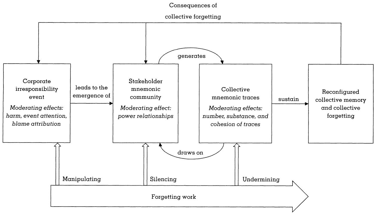 Why are some serious cases of corporate irresponsibility collectively forgotten? Drawing on social memory studies, we examine how this collective forgetting process can occur. We propose that a major instance of corporate irresponsibility leads to the emergence of a stakeholder mnemonic community that shares a common recollection of the past incident. This community generates and then draws on mnemonic traces to sustain a collective memory of the past event over time. In addition to the natural entropic tendency to forget, collective memory is also undermined by instrumental “forgetting work,” which we conceptualize in this article. Forgetting work involves manipulating short-term conditions of the event, silencing vocal “rememberers,” and undermining collective mnemonic traces that sustain a version of the past. This process can result in a reconfigured collective memory and collective forgetting of corporate irresponsibility events. Collective forgetting can have positive and negative consequences for the firm, stakeholders, and society.