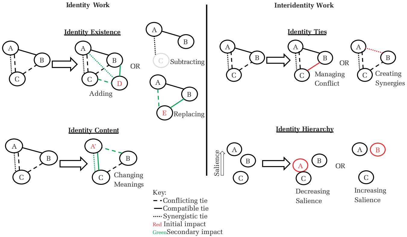 Rather than catalogue the extensive list of identity work tactics that have been identified (e.g., Brown, 2015, 2017; Caza, Vough et al., 2018), we use the structure of the identity network as a framework to derive general forms of identity work in response to identity threats and opportunities. As noted above, the identity network consists of a set of distinct identities that are related via ties and sorted into a hierarchy. If we take these basics of the identity network as our starting point, we can deduce four core forms of identity work, all of which are depicted in Figure 2. First, identity work can be geared toward changing the existence of identities either by adding, subtracting, or replacing identities. One may add identity $D$ , subtract identity $C _ { i }$ or replace identity $C$ with identity $E$ Second, identity work can be aimed at changing the content of the identities; one may shift the meanings and associated behaviors of identity $A$ such that $A$ becomes $A \mathrm { : }$ Third, individuals may focus on changing the ties between identities in the network. For example, the tie between identities $B$ and $C$ may be changed from conflicting to compatible, or the tie between identities $A$ and $B$ may be changed from compatible to synergistic. Finally, identity work can involve changing the hierarchical relationship between identities. The most salient identity, identity $A$ , may be moved down the hierarchy such that identity $B$ becomes most salient; alternatively, identity $B$ may be made more salient such that it becomes a close second in the hierarchy to identity $A$ While the first two forms of identity work—existence change and content change—implicate individual identities, the third and fourth forms pertain to changing the relationships between identities. Hence, in the following sections, we distinguish between identity work, which is targeted at addressing a single identity, and interidentity work, which is targeted at addressing the relationships between identities. We begin with the two forms of identity work. 与其罗列已识别出的大量身份工作策略(例如,Brown, 2015, 2017;Caza, Vough等人, 2018),我们采用身份网络的结构作为框架,以推导应对身份威胁与机遇的身份工作的一般形式。如前所述,身份网络由一组通过关联(ties)相互联系并按层级排序的不同身份构成。如果我们以身份网络的这些基本特征作为起点,就能推导出四种核心的身份工作形式,所有这些形式均在图2中有所描述。首先,身份工作可以针对身份的存在进行改变,具体方式包括添加、减去或替换身份。例如,可添加身份D,减去身份C_i,或用身份E替换身份C。其次,身份工作可以旨在改变身份的内容;例如,可调整身份A的含义及相关行为,使其转变为A:。第三,个体可能会专注于改变网络中身份之间的关联。例如,身份B与C之间的关联可能从冲突变为兼容,或者身份A与B之间的关联可能从兼容变为协同。最后,身份工作还可能涉及改变身份之间的层级关系。最显著的身份(即身份A)可能会在层级中下移,使得身份B成为最显著的身份;或者,身份B可能被赋予更高的显著性,从而成为身份A的第二近显著身份。虽然前两种身份工作形式——存在改变和内容改变——涉及个体身份,但第三和第四种形式则涉及改变身份之间的关系。因此,在以下各节中,我们区分针对单一身份的身份工作(identity work)和针对身份之间关系的身份间工作(interidentity work)。我们首先从两种身份工作形式开始介绍。