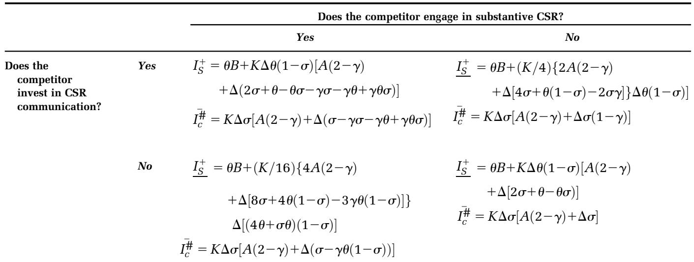 This section considers a version of the model in which CSR communication requires an investment of $I _ { c } > 0$ . At $t = 0$ , the firms simultaneously choose whether or not to invest in substantive CSR $\left( I _ { S } \right)$ and in CSR communication $( I _ { C } )$ . Both costly and zero-cost CSR activities are implemented. At $t = 1$ , CSR communication efforts are implemented, and the firms choose their quantities. It is further assumed that the costs of both investments are firm specific: $I _ { S } ^ { i } , I _ { C } ^ { i }$ where $t = F$ . $C .$ Let $\pi _ { i } ^ { s }$ denote the profit of firm $_ i$ under strategy $s$ ,where $s$ is a pair $S C$ describing the decision to invest $I _ { S }$ and $I _ { C } ,$ respectively. Hence, $S \in { Y Y , Y N , N Y , N N }$ , where $Y$ corresponds to “Yes” and $N$ to “No.” For example, $s$ $= Y N$ if the firm invests in substantive CSR and does not invest in CSR communication. In this model, symbolic CSR engagement is denoted by $s = N Y ;$ the firm does not invest in substantive CSR but undertakes CSR communication, in addition to other low-cost CSR activities with no impact in socioenvironmental outcomes. Moreover, note that $\pi _ { F } ^ { S }$ also depends on the strategy chosen by firm $C$ ,and vice versa. This section considers a version of the model in which CSR communication requires an investment of \( I_C > 0 \). At \( t = 0 \), the firms simultaneously choose whether or not to invest in substantive CSR (\( I_S \)) and in CSR communication (\( I_C \)). Both costly and zero-cost CSR activities are implemented. At \( t = 1 \), CSR communication efforts are implemented, and the firms choose their quantities. It is further assumed that the costs of both investments are firm specific: \( I_S^i, I_C^i \) where \( t = F \). \( C \). Let \( \pi_i^s \) denote the profit of firm \( i \) under strategy \( s \), where \( s \) is a pair \( SC \) describing the decision to invest \( I_S \) and \( I_C \), respectively. Hence, \( S \in \{ YY, YN, NY, NN \} \), where \( Y \) corresponds to “Yes” and \( N \) to “No.” For example, \( s = YN \) if the firm invests in substantive CSR and does not invest in CSR communication. In this model, symbolic CSR engagement is denoted by \( s = NY \); the firm does not invest in substantive CSR but undertakes CSR communication, in addition to other low-cost CSR activities with no impact in socioenvironmental outcomes. Moreover, note that \( \pi_F^S \) also depends on the strategy chosen by firm \( C \), and vice versa.