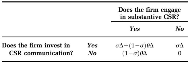 In addition to CSR communication, the firms also support other CSR activities, leading to either substantive or symbolic engagement. As already noted, the choice of symbolic CSR engagement involves low-cost CSR practices, activities, and initiatives that, when promoted by CSR communication efforts, may signal social responsibility without effectively impacting the negative socioenvironmental externalities generated by the firm. Examples include creating and supporting committees to evaluate a firm’s social responsibility initiatives (e.g., Hawn & Ioannou, 2016) or engaging in minimal corporate philanthropy (Cuypers et al., 2016). Given the low cost of this type of activity (e.g., Durand et al., 2019; Hawn & Ioannou, 2016) and for the sake of simplicity, the model assumes that these activities have zero cost for the firms. 除了企业社会责任(CSR)传播外,这些企业还支持其他企业社会责任活动,从而产生实质性或象征性的参与。如前所述,象征性企业社会责任参与的选择涉及低成本的企业社会责任实践、活动和举措,当通过企业社会责任传播努力推广时,这些实践、活动和举措可能会表明企业的社会责任,但不会有效影响企业产生的负面社会环境外部性。例如,成立和支持委员会来评估企业的社会责任举措(例如,Hawn & Ioannou,2016),或开展最低限度的企业慈善活动(Cuypers等人,2016)。鉴于此类活动的低成本(例如,Durand等人,2019;Hawn & Ioannou,2016),并且为了简化,该模型假设这些活动对企业没有成本。