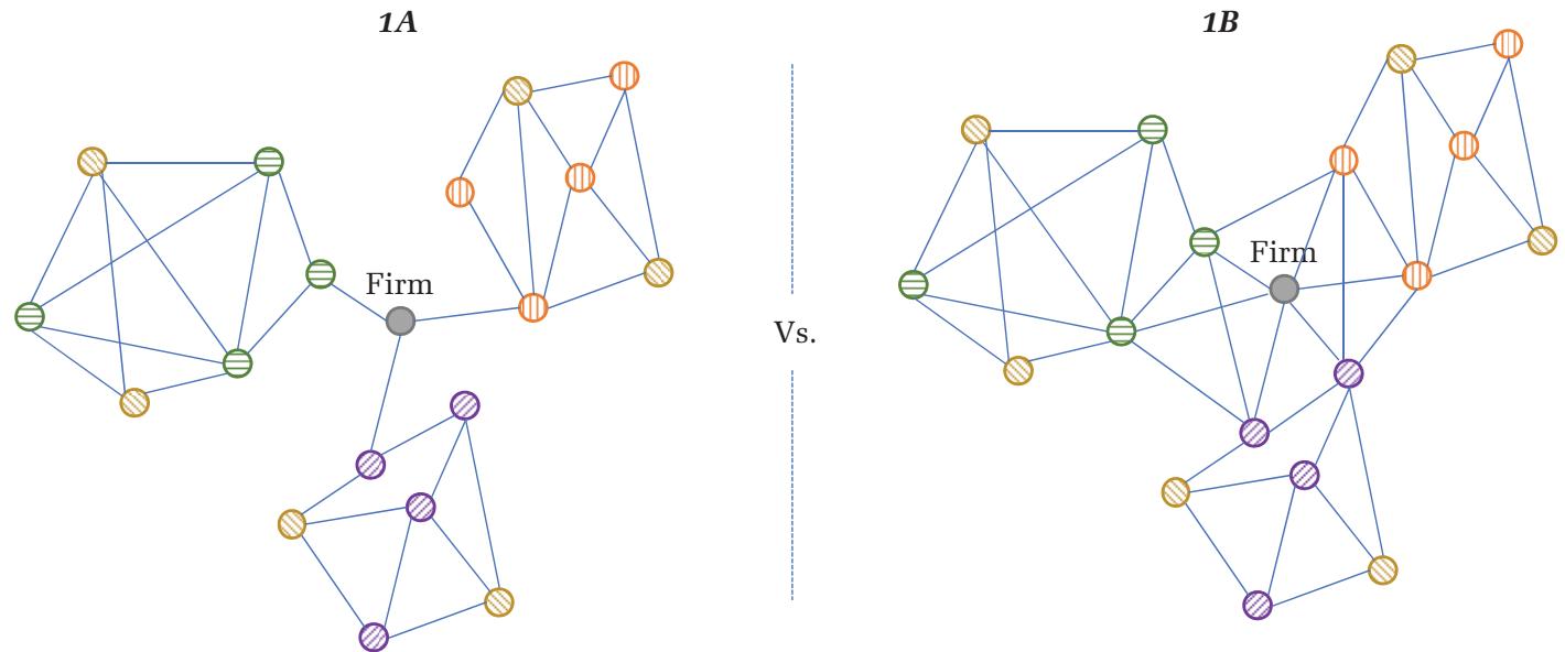 When there are weak or nonexistent connections between subcomponents, actors within a subcomponent are less likely to engage in mutual economic or social exchange with actors in another subcomponent. Seminal works in social network analysis by Simmel (1950) and Burt (1992, 2000), among others, have explained that such a network includes structural holes that managers may exploit to extract economic rents. When a firm occupies a structural hole (Figure 1A), defined as a network position that connects otherwise disconnected parties, managers act as the “brokers” of information with the ability to gather, recombine, and redirect resources to their advantage (Burt, 2004). 当子组件之间的连接微弱或不存在时,子组件内的参与者就不太可能与另一子组件中的参与者进行相互的经济或社会交换。西美尔(Simmel,1950)、伯特(Burt,1992、2000)等学者在社会网络分析方面的开创性著作解释说,此类网络包含结构洞,管理者可利用这些结构洞获取经济租金。当一家企业占据结构洞(图1A)时,即占据了一个连接原本不相连的各方的网络位置,管理者就充当信息的“经纪人”,能够收集、重组并将资源导向对其有利的方向(Burt,2004)。