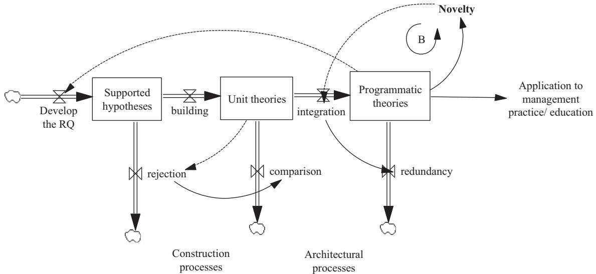 The fundamental concern over whether or not we have a testable theory is best addressed by formalizing the knowledge production process presented in our original work. The causal relationships in our original depiction can be recast as a dynamic system (Cronin & Vancouver, 2019; Sterman, 2000; Sterman, Oliva, Linderman, & Bendoly, 2015). We do this in Figure 1, where the rectangles represent stocks that hold and accumulate knowledge (in the form of supported hypotheses, unit theories, and programmatic theories) that our science creates. Such stocks are filled or emptied by processes called flows, represented by arrows with hourglass shapes (e.g., to add to the stock of unit theory, one builds a model out of supported hypotheses; to take away from that stock, one removes less accurate or incorrect unit theories).1 The curved arrows represent causal influence processes (e.g., the current stock of programmatic theories limits which research questions are important) that can create feedback loops within the system (e.g., the more unit theories you have in the stock, the easier to justify faulty hypotheses, thus shutting the “rejection” outflow). All of the causal relationships modeled are testable. 我们是否拥有可检验理论这一根本关切,最好通过将我们原始研究中呈现的知识生产过程形式化来解决。我们原始描述中的因果关系可重塑为动态系统(Cronin & Vancouver, 2019;Sterman, 2000;Sterman, Oliva, Linderman, & Bendoly, 2015)。我们在图1中进行了这一重塑,其中矩形代表积累知识(以得到支持的假设、单元理论和纲领性理论的形式)的存量,这些知识由我们的科学创造。这类存量通过被称为“流”的过程填充或清空,“流”由带有沙漏形状的箭头表示(例如,为了增加单元理论的存量,人们用得到支持的假设构建模型;为了减少该存量,人们移除准确性较低或错误的单元理论)。1 弯曲箭头代表因果影响过程(例如,当前纲领性理论的存量限制了哪些研究问题是重要的),这些过程可能在系统内形成反馈循环(例如,存量中的单元理论越多,就越容易为错误假设辩护,从而关闭“拒绝”这一流出)。所有被建模的因果关系都是可检验的。