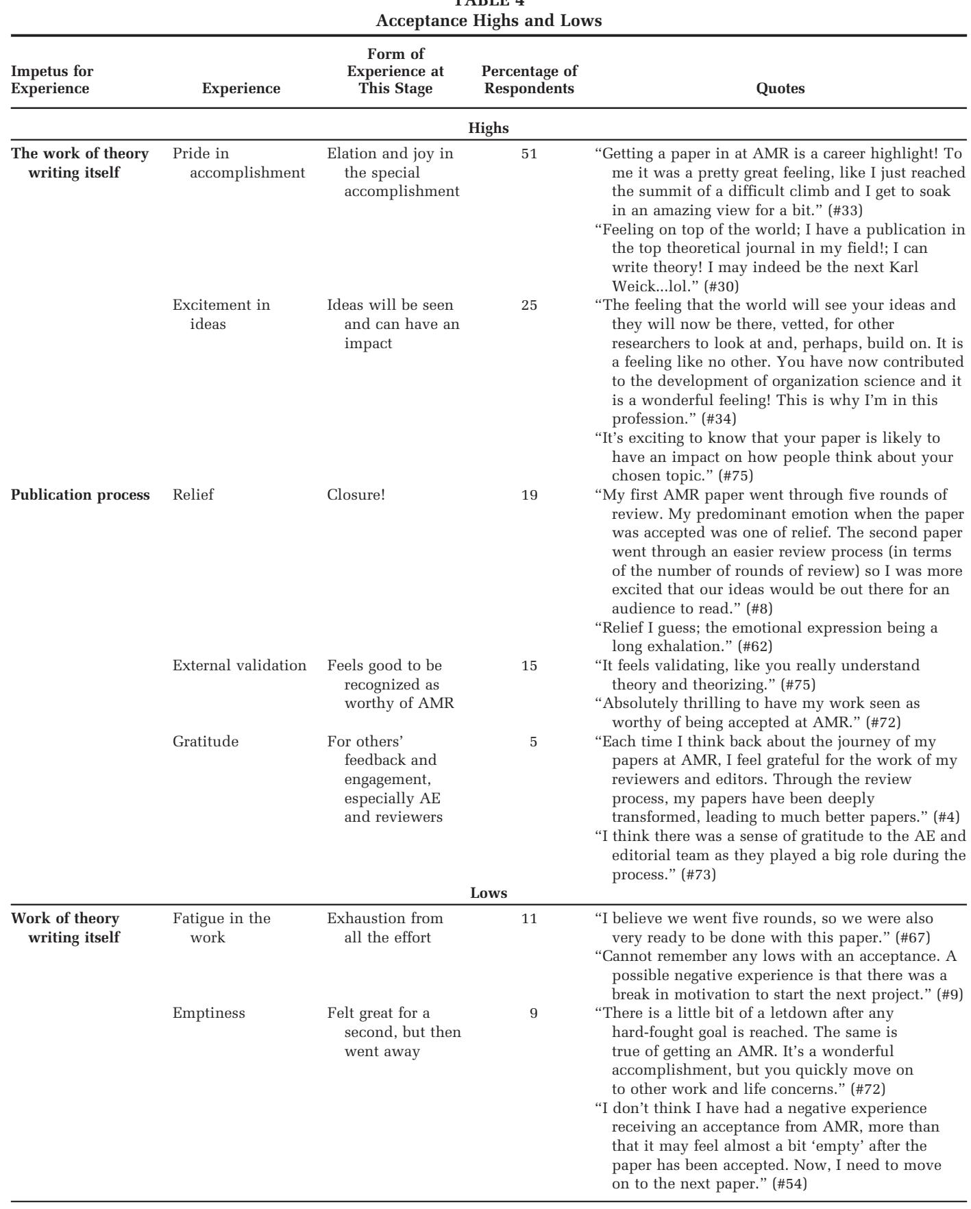 Lows. Not surprisingly, respondents did not recognize many lows associated with an acceptance. One respondent even said, “You must be joking. How can you feel low with an acceptance at AMR?” (#69). However, in those that did respond, interesting themes emerged about the unexpected downsides of a manuscript’s success. 低谷。不足为奇的是,受访者并未意识到与“接受”相关的许多低谷。有一位受访者甚至表示:“你一定是在开玩笑。在获得AMR的录用时,怎么会感到低落呢?”(#69)。然而,在那些做出回应的受访者中,关于稿件成功带来的意外弊端的有趣主题浮现出来。