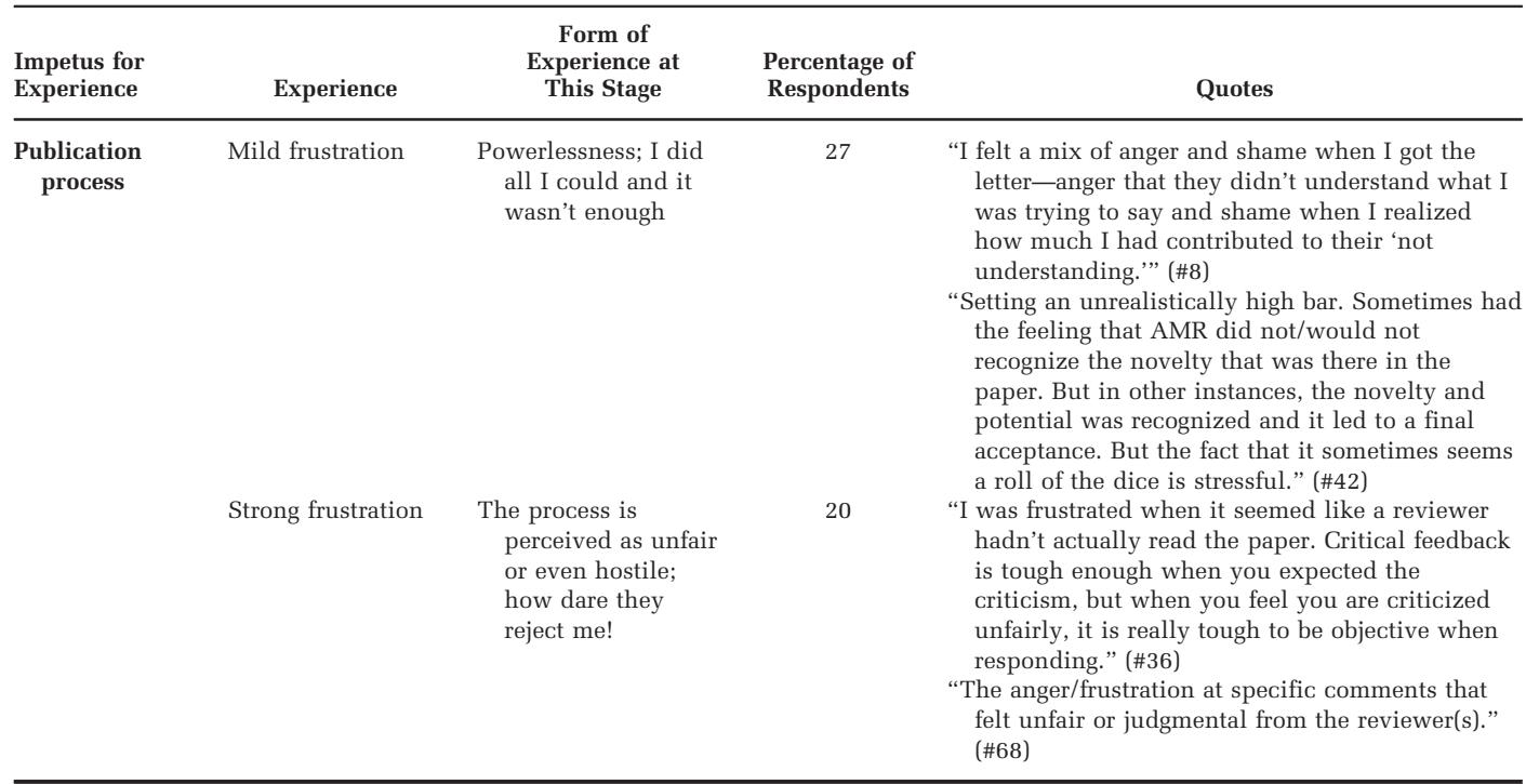 Lows. In contrast to the initial submission where we noted two targets of frustration (i.e., the writing itself or the publishing process), at the R&R stage all frustrations seem to be oriented toward the process. However, these frustrations came in two distinct varieties. The first we label as a mild frustration, which includes a feeling that one is not perfectly “heard” or “understood” by the review team, combined with a feeling that authors lack power or are “completely at the mercy” of others. As noted by one respondent: 低。与我们最初提交时指出的两个挫折目标(即写作本身或出版过程)相比,在修改与重审(R&R)阶段,所有挫折似乎都集中在过程上。然而,这些挫折有两种截然不同的类型。第一种我们称之为轻微挫折,包括一种感觉,即作者觉得自己没有被评审团队完全“倾听”或“理解”,同时还觉得作者缺乏权力或“完全受他人摆布”。正如一位受访者所指出的: