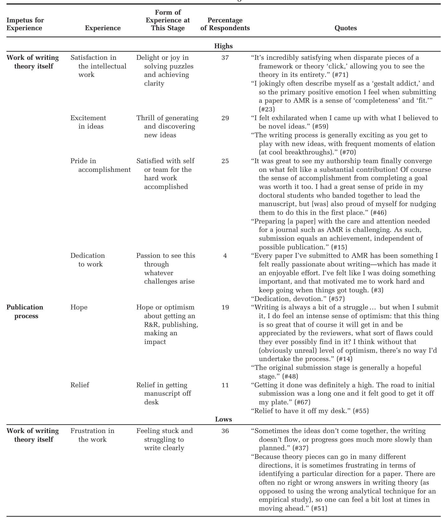 Before presenting details, we note three interesting patterns with the psychological “highs” and “lows” experienced throughout the publication process at AMR. First, many positive and negative experiences reemerged in multiple phases of the publication process. For example, pride in the accomplishment of the work was a repeated positive experience across each stage (even rejection!), while frustration was a commonly repeated negative experience. When these recurring experiences resurfaced in new phases, they often moved between the psychological foreground and background and took distinct forms. We outline below how the highs and lows of writing theory for AMR both recur and evolve in form from one publication phase to another. A second pattern we noticed was that these emotional experiences seemed to stem from one of two sources—from the work of theory writing itself or from aspects of the publication process. As such, we organize and label the tables and text according to this distinction. The third pattern we detected was that respondents felt the experience of writing for AMR often differed from that of other journals. We share insights contrasting the highs and lows of writing theory for AMR with experiences at other journals, which suggested that the highs sometimes feel higher and the lows sometimes feel lower when writing for AMR. 在介绍具体内容之前,我们注意到在AMR整个发表过程中,心理上的“高峰”和“低谷”存在三个有趣的模式。首先,许多积极和消极的经历在发表过程的多个阶段中反复出现。例如,对工作成果的自豪感是每个阶段(甚至是被拒阶段!)都重复出现的积极体验,而挫败感则是常见的重复出现的消极体验。当这些反复出现的经历在新的阶段再次出现时,它们往往会在心理的前景和背景之间转换,并呈现出不同的形式。我们将在下文概述AMR理论写作的高峰和低谷如何从一个发表阶段到另一个阶段既重复出现又在形式上有所演变。我们注意到的第二个模式是,这些情感体验似乎源于两个来源之一——理论写作本身的工作,或者是发表过程的某些方面。因此,我们根据这一区别对表格和文本进行组织和标注。我们发现的第三个模式是,受访者认为为AMR写作的体验往往与其他期刊不同。我们分享了将AMR理论写作的高峰和低谷与其他期刊的经历进行对比的见解,这表明在为AMR写作时,高峰有时会感觉更高,低谷有时会感觉更低。