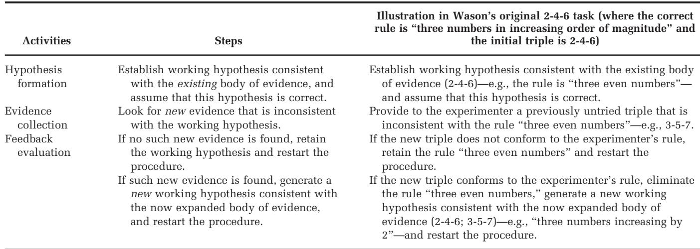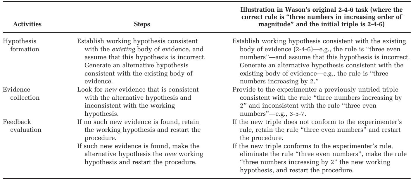 Table 4 specifies the steps involved in disconfirmation, and classifies each in terms of the three broad activities involved in hypothesis testing—namely hypothesis formation, evidence collection, and feedback evaluation. The final column illustrates the use of the heuristic in Wason’s (1960) 2-4-6 task, enumerating the implementation of each step from the beginning of the experiment. 表4详细说明了证伪过程中的步骤,并根据假设检验涉及的三大类活动(即假设形成、证据收集和反馈评估)对每个步骤进行了分类。最后一列展示了该启发式方法在沃森(1960)的2-4-6任务中的应用,列举了实验开始时每个步骤的具体实施方式。