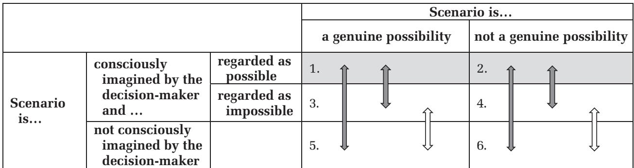 Cells 1 and 2 of Table 1 contain scenarios imagined and regarded as possible by the decision-maker, split between those that are correctly (cell 1), and those that are mistakenly (cell 2), regarded as such. Taken together, the scenarios in these two cells therefore constitute the decision-maker’s scenario space, indicated by the shaded area. The scenarios in cells 3 and 4 are those consciously imagined by the decisionmaker but excluded from the scenario space because they are regarded as impossible, correctly so in cell 4 but mistakenly so in cell 3. The scenarios in cells 5 and 6 also lie outside the scenario space, having not even entered the imagination of the decision-maker. 表1中的单元格1和2包含决策者设想并认为可能的场景,分为被正确(单元格1)和错误(单元格2)视为可能的场景。综合来看,这两个单元格中的场景构成了决策者的场景空间,以阴影区域表示。单元格3和4中的场景是决策者有意识地设想的,但因被认为不可能而被排除在场景空间之外,其中单元格4是正确的,而单元格3是错误的。单元格5和6中的场景也不在场景空间内,甚至未进入决策者的想象。
