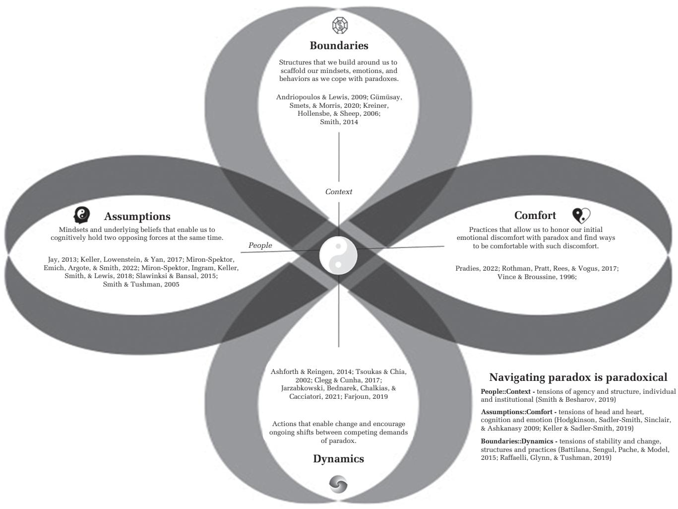 Juxtaposing varied research highlights the paradoxes embedded in approaches for navigating paradox. As noted in Figure 1, these include tensions between people and context (between the axes), assumptions and comfort (between poles of the horizontal axis), and boundaries and dynamics (between poles of the vertical axis). We unpack the nature of these tensions in general and examine how these paradoxical approaches enable the navigation of paradox. 将不同的研究并置在一起,突显了在应对悖论的方法中所蕴含的矛盾。如图1所示,这些矛盾包括人与情境之间的张力(在坐标轴之间)、假设与舒适之间的张力(在水平轴的两极之间),以及边界与动态之间的张力(在垂直轴的两极之间)。我们将一般性地剖析这些张力的本质,并探讨这些悖论性方法如何助力人们应对悖论。