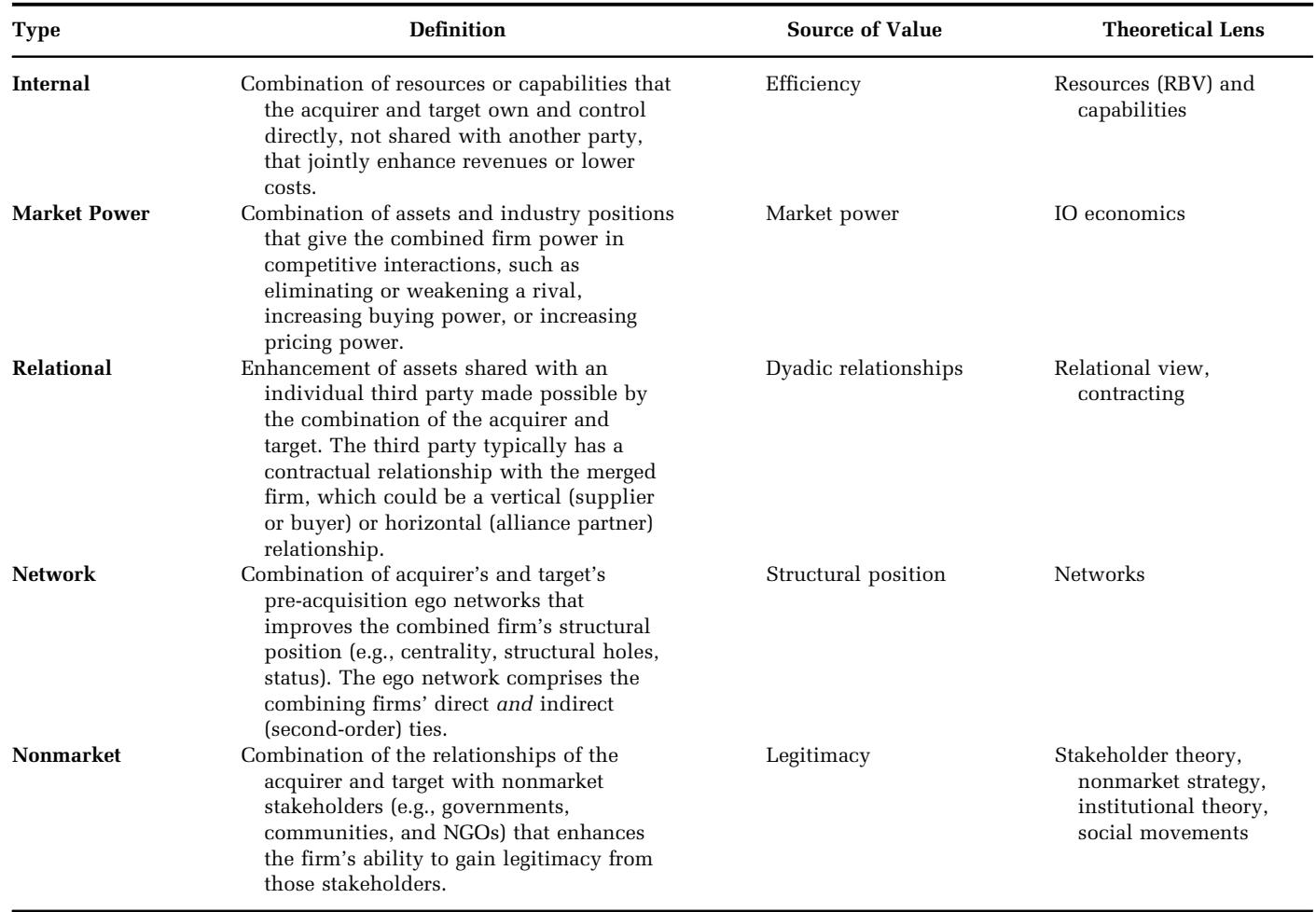 We incorporate these external cooperative perspectives into M&A research in three ways. First, we develop a theoretically parsimonious typology of five sources of potential synergy based on two underlying dimensions: the level of analysis at which valuable activities occur (firm, dyad, network, industry, or institutional context) and the governance orientation by which those activities are managed (fiat, cooperation, or market competition). This allows us to introduce three new synergy types—relational, network, and nonmarket—and to put the two long-considered in the literature (internal, also known as operational, and market power) into a systematic framework. The five synergies map onto distinct theories of economic rent: RBV theories, IO economics, the relational view, social networks theory, and stakeholder theory. This results in a classification focused on sources of synergy rather than their manifestations (e.g., abnormal returns, revenues, and costs), which has been the focus of most prior research (Andrade, Mitchell, & Stafford, 2001; Capron & Pistre, 2002). 我们通过三种方式将这些外部合作视角纳入并购研究。首先,我们基于两个潜在维度,构建了一个理论上简洁的五种潜在协同来源类型学:有价值活动发生的分析层面(企业、二元组、网络、行业或制度背景),以及管理这些活动的治理导向(命令控制、合作或市场竞争)。这使我们能够引入三种新的协同类型——关系型、网络型和非市场型,并将文献中长期研究的两种协同类型(内部型,也称为运营型,以及市场力量型)纳入一个系统框架。这五种协同效应对应不同的经济租金理论:资源基础观(RBV)理论、产业组织(IO)经济学、关系观、社会网络理论和利益相关者理论。这一分类侧重于协同效应的来源而非其表现形式(例如,异常回报、收入和成本),而这正是大多数先前研究的焦点(Andrade, Mitchell, & Stafford, 2001;Capron & Pistre, 2002)。