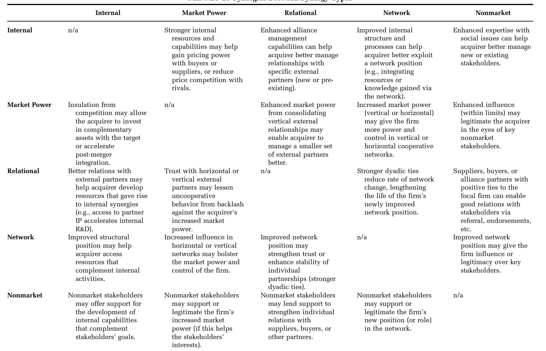 Table 2 contrasts relational synergies with other types. Internal synergies are driven only by the combination of assets owned by the acquirer and target, not partner-specific assets. For example, if two firms combine their alliance management capabilities (Kale, Dyer, & Singh, 2002) to better manage any collaborative project, that would be an internal synergy. In contrast, relational synergies involve the creation or improvement of partner-specific assets that allow the combined firm to derive more value from specific external partners (e.g., p3 in Figure 2). Like market power synergies, relational gains make interactions with other firms more profitable. But they are distinct in two ways. First, the exchange producing relational rents is governed cooperatively, not competitively (Dyer & Singh, 1998). Second, market power synergies give the acquirer power over a counterparty (zero sum), while relational synergies allow both parties to create and appropriate more value. 表2对比了关系协同效应与其他类型协同效应。内部协同效应仅由收购方和目标方拥有的资产组合驱动,而非特定于合作伙伴的资产。例如,如果两家公司结合其联盟管理能力(Kale、Dyer和Singh,2002)以更好地管理任何合作项目,这将是一种内部协同效应。相比之下,关系协同效应涉及创建或改进特定于合作伙伴的资产,使合并后的公司能够从特定外部合作伙伴(例如图2中的p3)中获得更多价值。与市场力量协同效应类似,关系收益使与其他公司的互动更有利可图。但它们在两个方面存在区别。首先,产生关系租金的交换是通过合作而非竞争来管理的(Dyer & Singh,1998)。其次,市场力量协同效应赋予收购方对交易对手的权力(零和),而关系协同效应则允许双方创造并获取更多价值。