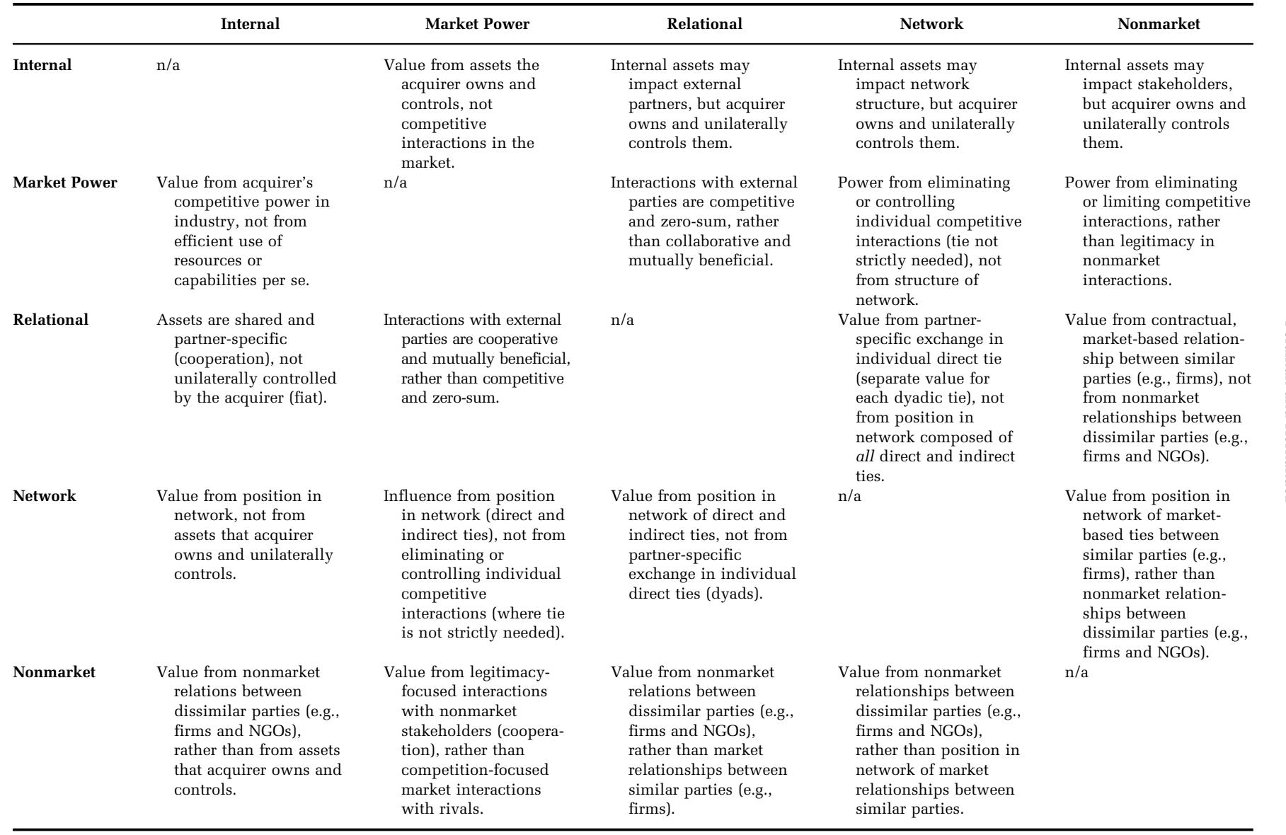 Juxtaposing the two dimensions allows us to parsimoniously classify five synergy types: internal, market power, relational, network, and nonmarket.4 将这两个维度并列,可以让我们简洁地将五种协同类型分类:内部协同、市场力量协同、关系协同、网络协同和非市场协同。4