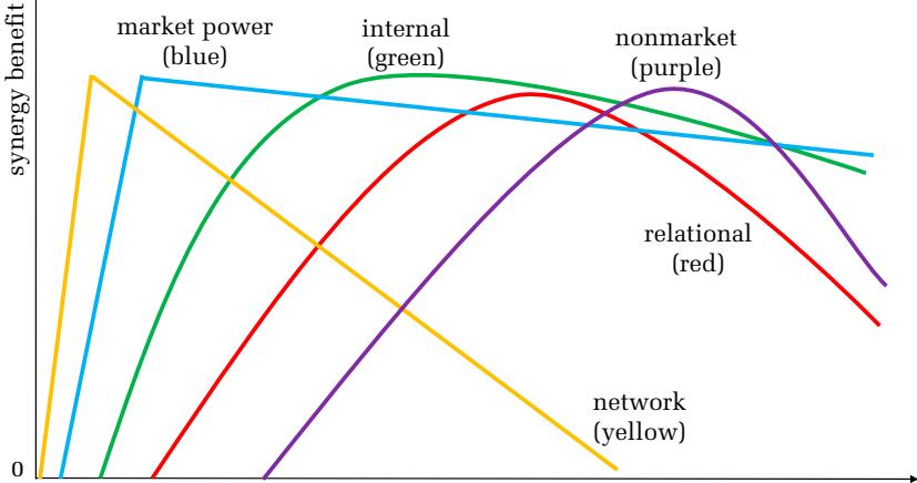 When it comes to internal synergies, fiat provides the authority to make necessary adjustments to maintain sources of value without depending on an external entity. As a result, internal gains can last for a relatively long period (assuming competent management). The logic of market competition denotes that greater market power gives firms the ability to act more unilaterally than before on the industry forces that shape the distribution of rents (in equilibrium). These monopoly-like rents persist until other changes in the industry modify competitive conditions (we explore those conditions later). The other synergies, governed by cooperative orientations, provide less control over the underlying sources of value, but important differences exist among the three. 当谈及内部协同效应时,法币(fiat)拥有进行必要调整以维持价值来源的权威,而无需依赖外部实体。因此,内部收益可以持续相对较长的时间(假设管理得当)。市场竞争的逻辑表明,更大的市场影响力使企业能够比以往更单方面地影响塑造租金分配的行业力量(在均衡状态下)。这些类似垄断的租金会持续存在,直到行业中出现其他变化,改变竞争条件(我们稍后会探讨这些条件)。其他由合作导向主导的协同效应对价值的根本来源控制较少,但三者之间存在重要差异。