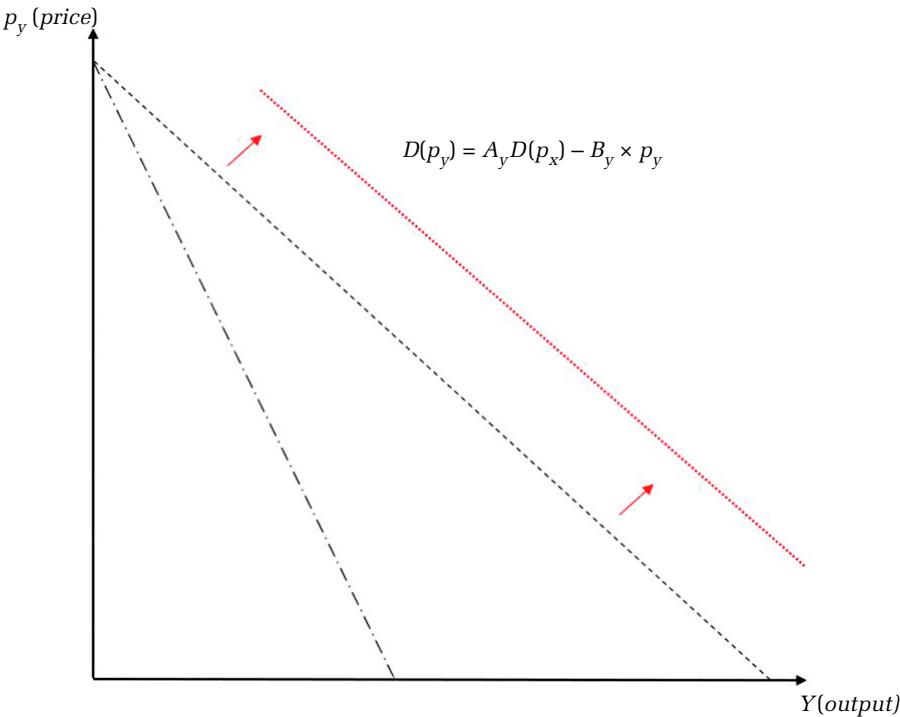 We construct our MSP such that demand on the donor side is a function of demand on the client side. We represent the cross-platform effect by multiplying the donor intercept, $A _ { y } ,$ by the consumption from the client side, $D ( p _ { x } )$ . This market is sketched out visually in Figure A1. Note that the intercept shifts outward with increases in client consumption, $X$ . 我们构建的MSP(可能是某种市场结构或模型)使得捐赠方的需求是客户方需求的函数。我们通过将捐赠方截距 \( A_y \) 与客户方的消费 \( D(p_x) \) 相乘来表示跨平台效应。该市场的情况在图A1中以图形形式展示。需要注意的是,随着客户消费 \( X \) 的增加,截距会向外移动。