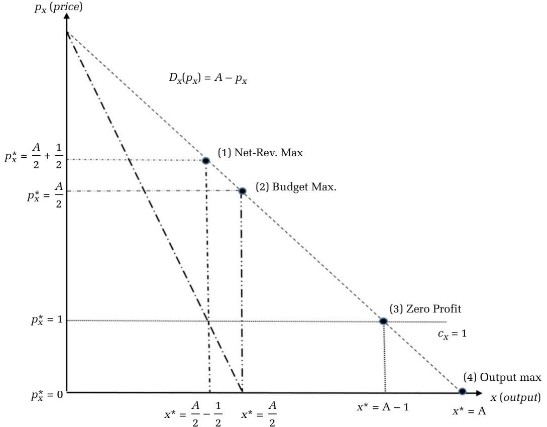 Note: This illustration uses a simple linear demand function, $D ( p _ { x } ) = A - p _ { x }$ and unit cost, $c _ { x } = 1$ , to illustrate how optimal pricing and out put depends upon the maximand. 注:此图使用简单的线性需求函数 \( D(p_x) = A - p_x \) 和单位成本 \( c_x = 1 \),以说明最优定价和产出如何取决于目标函数。